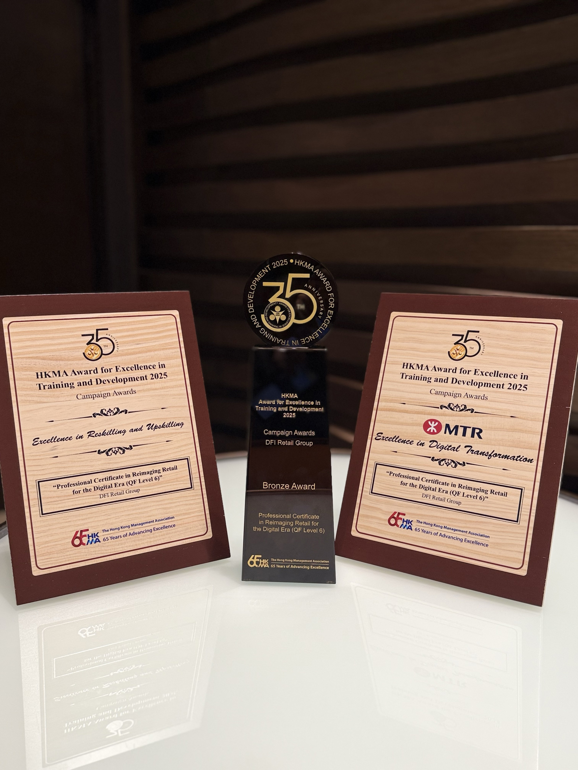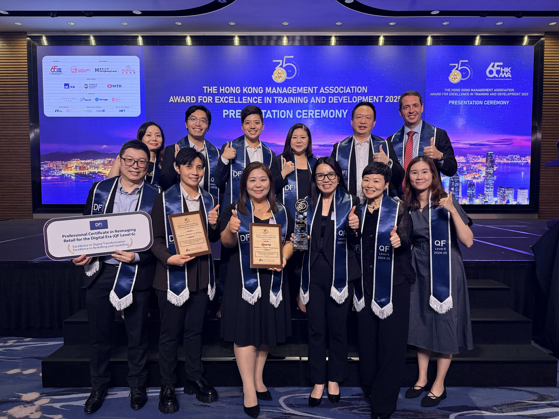 DFI 零售集团为香港零售业量身打造的创新性 资历架构第六级课程(等同于硕士学位)荣获 2025 年「HKMA 最佳管理培训及发展奖」的三项殊荣,包括「培训及发展计划奖项」铜奖、数位转型卓越奖技能提升及技能再造卓越奖