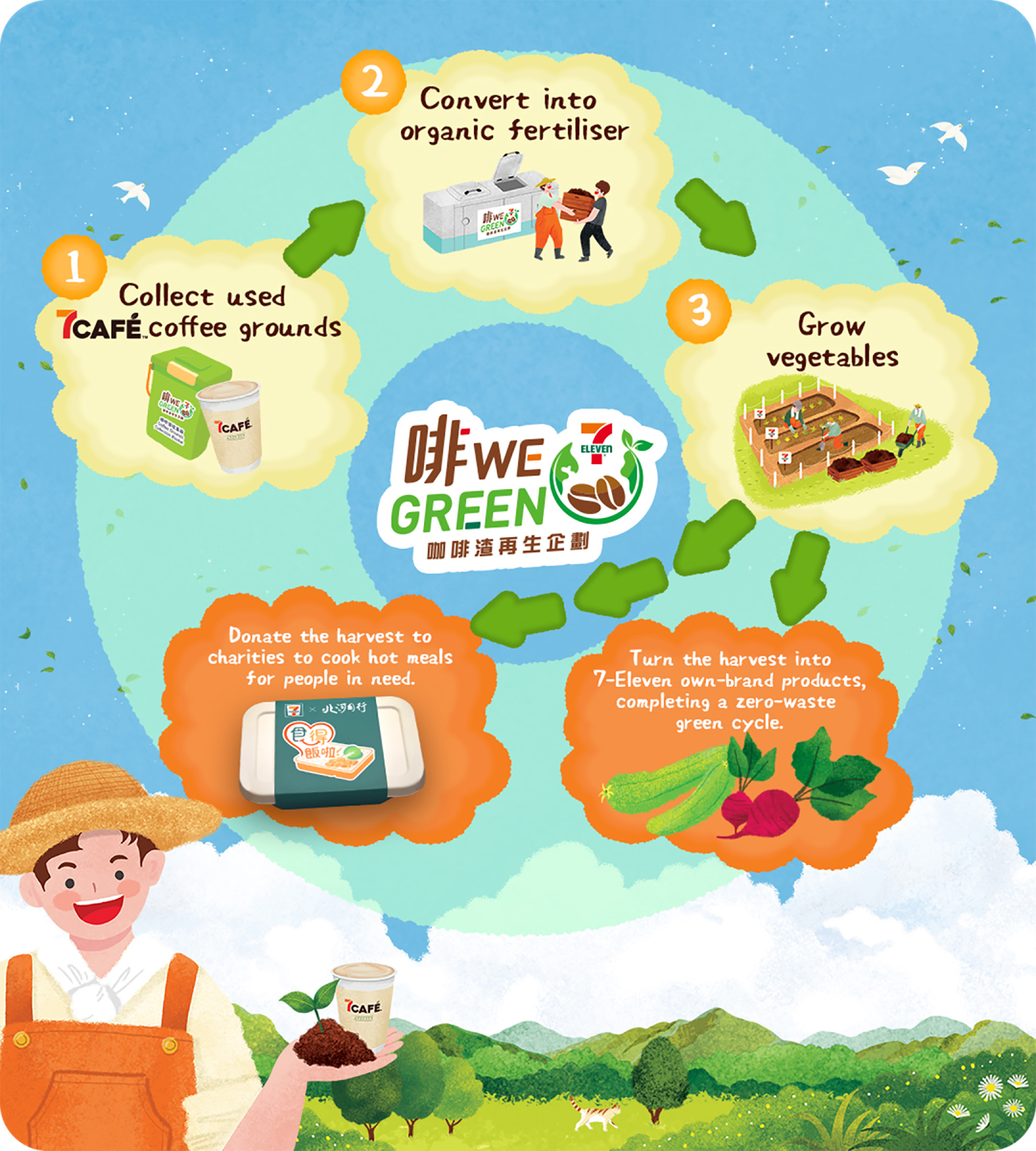 7‑Eleven 香港於 2024 年推出《啡 We Green 咖啡渣再生企劃》,將 7CAFÉ 使用後的咖啡渣轉化為天然肥料,用於栽種新鮮農作物,推動循環經濟並支持社會影響目標。至 2025 年,企劃進一步擴展為跨界合作,聯同本地社會企業 新生農場、慈善機構膳心連基金,以及 WeGen Farming 與美心集團攜手推行。咖啡渣被轉化為天然酵素及肥料,用於新生農場及 WeGen Farming 栽種的時令作物。